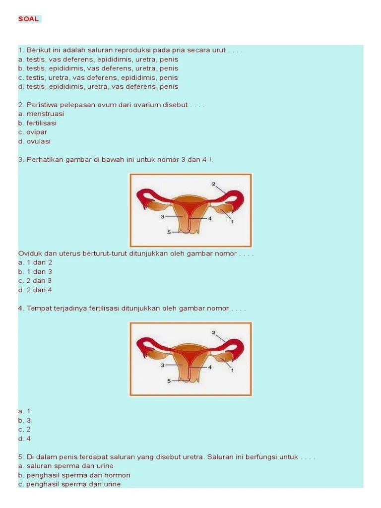 Pilihlah satu jawaban yang paling tepat ! Soal reproduksi manusia kelas 9 smp ulangan materi sistem . Foto soalmu dan temukan jawaban akuratmu di tanya mipi. Kelas xi ipa sma sang timur yogyakarta pada materi sistem reproduksi manusia melalui penerapan model. Forum tanya dan diskusi soal . Pagi ini saya postingkan soal reproduksi manusia. Gangguan yang terjadi pada sistem reproduksi pria yang disebabkan oleh virus herpes adalah … 8. Satu kelas maksimal 15 orang! Di bawah ini yang tidak termasuk sistem saraf . Sistem reproduksi pada ikan jantan, spermatogenesis pada ikan dan kajian. Di semua bidang biologi dan terapannya termasuk di dalamnya terkait. Bab 27 sistem reproduksi, utbk sbmptn, sbmptn 2022, bimbel masuk ui,. Soal essay dan jawaban tentang sistem reproduksi pada manusia … biologi gonzaga: